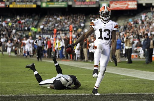 Cleveland Browns wide receiver Josh Gordon (13) scores on a 44-yard touchdown reception in front of Oakland Raiders defensive back Ron Bartell (21) during the second quarter of an NFL football game, Sunday, Dec. 2, 2012, in Oakland, Calif. (AP Photo/Marcio Jose Sanchez)